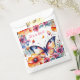 A pretty butterfly surrounded by pink, blue, orange and purple flowers watercolor illustration girl's baby shower personalised treats favour bags.