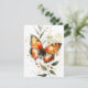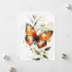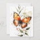 A vibrant orange and black butterfly is depicted with delicate wings spread wide, surrounded by abstract leaves and splashes of watercolor. Soft green and cream tones in the leaves add a serene background to this dynamic composition.
