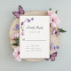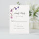 An enchanting watercolor illustration with a butterfly theme, featuring purple butterflies and purple and pink wildflowers in a cute, adorable style. The elegant, playful calligraphy puts an extra touch on the title and decorates this baby girl shower RSVP card that is perfect for a spring or summer celebration.