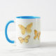 A white mug with a blue rim and handle and a delicate painted desing of orange butterflies.