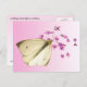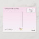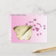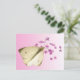This postcard features the exquisite cabbage butterfly (Pieris rapae). She has stopped flitting around the garden long enough to perch on a verbena blossom. She has a black body which does not show beneath her four white wings, each with a black dot at the centre. The two upper wings have a black band at the tips. Her face is a pale green. Although she is a lovely, delicate creature, her caterpillars devour cabbages and other member of the brassica family of vegetables. The reverse has one tiny butterfly on a pale pink gradient background.