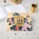 Butterfly & Peonies by Hokusai + a golden frame (coat-of-arms or crest style) with large black numbers 80th and "Birthday Celebration" (not customisable) into an half transparent yellow background. Design on hard cover guest book invitation with name and date to customise. You can easily change text (colour, font, size and position) by clicking the personalise or customise button. Matching birthday invitation and birthday Save the Date.