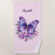 A girly pink background decorated with a purple butterfly, pink and purple flowers. Personalise and add your name.