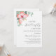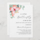 A chic white background. Decorated with a rose gold and blush pink butterfly, green watercolored eucalyptus leaves, sprigs, greenery and a faux gold sprig. Personalise and add the name of the mum to be and party details.