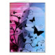 This design features silhouettes of butterflies and flowers on a blue and pink abstract background.