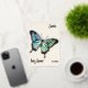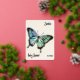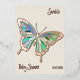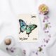 The front features a delightful butterfly in a chic blend of blue and green, with shimmering pink gold accents against a light beige backdrop. The mother's name is showcased in an elegant serif font, complemented by "Baby Shower" in luxurious foil script alongside the event date.