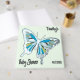 Discover the ultimate keepsake for your baby shower, a personalised guest book that radiates luxury and charm. The front cover displays a cute butterfly in a sweet trendy palette of blue and green surrounded with real silver foil. the Baby’s name is written in an elegant serif font, complemented by "Baby Shower" in an exquisite script in real foil.