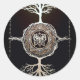 Unique silver and gold mandala design on a black background with a butterfly in the core and geometric designs around it, all encased by two trees and their intertwined roots.