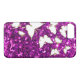 Girly butterfly smartphone case including beautiful simulated purple glitter bling digitally printed on the cover, along with pretty butterflies in white with gold coloured edging. Cover your cell phone in style with a touch of nature and bling.