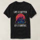 I give wanted to give this a 4 instead of a 5 because these Basic DARK T0shirts run unexpectedly SLIM or Narrow. Which is great if you do not have a potbelly, but I have a paunch. It isn't the shirt's fault that I've got a beer belly. The design and shirt itself is a quality cotton shirt. The color is more of a deep purple, but still a very pretty color. The Basic DARK T-shirts run a bit SLIMMER than the Basic Ts. The neck is a fraction narrower (or seems to be narrower) also. I'm a paunchy middle-aged woman and my neck is 12 inches (31cm) thick and the neckline fell about the same as in the photo of the man, and I had the desire to tug it a bit. So if you're a thick necked man or like loose shirts, be aware these are slimmer shirts. Once I get rid of my lockdown paunch it'll look great. The shirt washed well in cold water with no apparent bleeding. We don't have a dryer, so it hung dry. Did not shrink. Love the colors and the design. The design looks smaller on my shirt than it does on the model on-line. But still, it looks good on the shirt. The printing looks as it does on the model, just the size seems fractionally smaller. Washed garment in cold water, hung dry and design appeared unaffected.