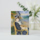 A postcard with the painting, By the Seashore (1883) by the French painter Pierre-Auguste Renoir (1841-1919). A portrait of a seated young woman in a blue Victorian dress and bonnet on the beach at the seacoast. Renoir was deeply influenced by renaissance art after a trip to Italy in 1881-82.