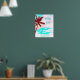Travel poster print of a palm tree in Byron Bay, a coastal town in NSW, Australia in an arty modern colorful vintage style of travel art print. Blue sky, Summer vibe with tropical palm tree hipster vibe in country Australia.
