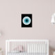 A cybernetic blue eye with various digital displays, including circles, dots, and squares, some lit up and some not, with a small crosshair in the middle and the word "vision" backwards on the bottom right.