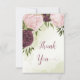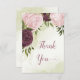 Beautiful wedding thank you card featuring cabernet purple and pink flowers and green leaves
