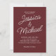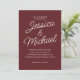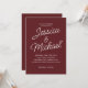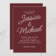 This elegant burgundy wedding invitation features a minimalist layout with romantic script accents and crisp white text on a rich wine-red background. The classic and refined design is perfect for fall or winter weddings, vineyard ceremonies, or formal evening affairs. Easily customisable with your names and wedding details, this timeless template adds warmth and sophistication to your special day. Coordinating RSVP and detail cards available for a cohesive suite.
