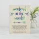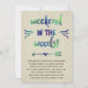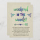 This cute, rustic-chic invitation for a "glamping" bachelorette party at a cabin features a pretty brush script calligraphy that reads "Weekend in the woods!" with a green, blue, and purple watercolor effect. The design also includes a heart and arrow, pretty flourishes, and a wood texture background.