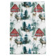 Winter scene with a cabin in woods with evergreen trees and Christmas deer, modern holiday pattern.