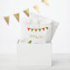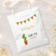 Cactus birthday favour bag, fiesta and fun. Red and green bunting flags and a cute smiling cactus as decoration. Colours red and green. White background colour. With the text: Fiesta and Fun and Thank You! Template for a name.