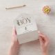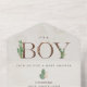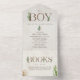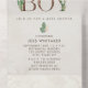 Neutral boho baby shower theme with "BOY" and "BOOKS" lettering in leather inspired faux texture decorated with boho cactus and other botanical designs. Botanical designs at corners. Background is watercolor inspired.