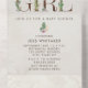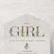 Neutral boho baby shower theme with "GIRL" and "BOOKS" lettering in leather inspired faux texture decorated with boho cactus, florals and other botanical designs. Botanical designs at corners. Background is watercolor inspired.