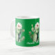 This coffee mug is decorated with three beautiful cacti, cactuses on a green background with the words "handle with care" below the centre cactus.