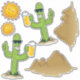 Cartoon of smiling cactus with sunglasses holding a beer mug and giving thumbs up. Sun and mountains icons.