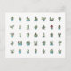 Trendy and modern style postcard with cute botanical illustration. Hand drawn 35 different flowering cactuses and succulents in blue pots.