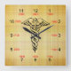 Distressed brown tartan background, Caduceus graphic and 24-hour clock face