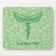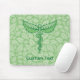 Single snake caduceus with mint leaves on light green seamless background. Custom text.