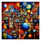A.I. created meaningless geometrical celestial abstract composition of planets, stars, lines, shapes and colours in an arrangement which pleased the senses of the artist.