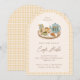 Throw a café or coffee-themed baby shower with this cute baby shower invitation, featuring a gingham pattern background and illustrated scene with coffee pot, cups, flowers and croissants, and the headline, "Café Bébé".
