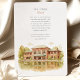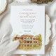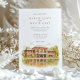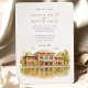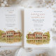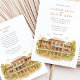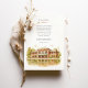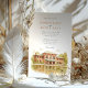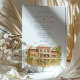 Invite your guests to a beautiful celebration with this charming watercolor wedding invitation, showcasing the historic Café Brauer in Chicago's Lincoln Park. The artwork exquisitely captures the Prairie style architecture of the building, with its distinctive reddish-brown/terracotta brick and green roof accents (notably the large awning), beautifully reflected in the tranquil water of the adjacent pond or lagoon. The scene is surrounded by lush trees, their leaves depicted in shades of green, golden yellow, and light brown, hinting at a late summer or early autumn ambiance. Rendered in a soft, inviting watercolor style, this invitation is perfect for couples seeking an elegant yet natural setting for their Chicago wedding. The front elegantly presents your wedding details, while the reverse side offers "The Finer Details" for guest information, maintaining the picturesque artwork. The colour palette includes warm reddish-browns, terracottas, various greens, golden yellows, light browns, and soft water tones.