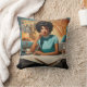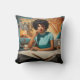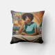 The "Café Chronicle: Retro Newsreader" throw pillow captures the essence of a bygone era, featuring a Black woman deeply engrossed in the day's headlines, coffee at the ready. This scene is set in a classic diner, with vintage elements that evoke the charm of the past. The teal typewriter and matching attire of the woman add a splash of colour and a dash of mid-century style to the composition. This pillow is perfect for adding a nostalgic touch to any space, offering a blend of comfort and conversation-starting design. Crafted for those who cherish the romance of reading the newspaper in a quaint café, it's a cosy addition to any home.