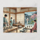 The watercolor painting beautifully depicts the serene and harmonious atmosphere of a tranquil coffee shop in Kyoto. The warm wooden panels and shoji screens softly diffuse sunlight into the space, creating an inviting glow. Low wooden tables with tatami cushions add a traditional touch, while sleek black light fixtures provide a modern contrast. A barista in a linen apron gracefully prepares pour-over coffee, steam rising delicately in the calm setting. A woman in a light blue kimono enjoys a matcha latte, and a couple nearby shares wagashi sweets, their lively expressions adding warmth. Beyond the large sliding doors, a small zen garden with mossy stones and a cherry blossom tree in full bloom brings vibrant pink hues, complementing the neutral beige and brown tones of the interior. The scene captures Kyoto's perfect blend of tradition and modernity.