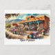 The painting captures a quiet moment at a small cafe in Taos, where adobe-style walls are adorned with turquoise shutters that pop vividly against the warm terracotta facade. Patrons relax at rustic wooden tables draped with vibrant woven textiles, sipping coffee and chatting. Brightly coloured pots of desert blooms flank the entrance, blending seamlessly with the earthy tones of the architecture. The backdrop of towering desert mountains and a brilliant blue sky adds depth and grandeur to the scene, reflecting the harmony of Taos’ natural and cultural landscapes. The cafe radiates warmth and creativity, a microcosm of the town’s eclectic vibe.