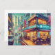 The small coffeeshop depicted in the painting exudes a harmonious blend of rustic charm and futuristic flair. Neon-lit kanji signs glow softly against the backdrop of wooden panelling and metallic accents. Inside, the ambiance is cosy and inviting, with sleek tables paired with comfortable chairs and soft, amber lighting casting a warm hue. Hints of cherry blossoms outside the window enhance the atmosphere, offering a serene contrast to the high-tech details visible in the bustling street. A mix of locals and visitors sip on steaming cups of coffee, sharing stories or enjoying a quiet moment, embodying the heart of Tokyo's community spirit.