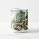 The watercolor painting beautifully captures a tranquil street scene at a small café in Washington D.C. The image portrays a serene yet lively atmosphere typical of a bustling urban area. The café, nestled amongst city buildings, exudes local charm with its inviting outdoor seating. People are seen enjoying their beverages, engaged in conversations or immersed in their books, contributing to a laid-back vibe amidst the city's vibrancy. The décor of the café features warm tones and rustic accents, with green plants adding a touch of nature against the urban backdrop.
