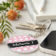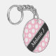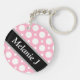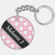 Modern 2-sided round acrylic keychain with an assorted polka dot pattern with alternating sizes of white circles over a cafe-style pink. Your name or custom text is printed diagonally in white over an off-centred diagonal black stripe on both sides.