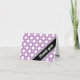 Thank you cards with an assorted polka dot pattern with alternating sizes of white circles over a cafe-style purple. "thank you" is printed diagonally in white on the front over a diagonal black stripe across the lower right corner. The inside is custom printed with your own text, or may be easily left blank handwriting your own sentiments of thanks. Surrounding this template text area is the same assorted polka dot pattern, a unique element as opposed to your typical white interior. This style and colour scheme make these cards an appropriate choice for Bridal Showers, Baby Showers, and Birthdays.
