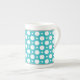 Bone China Mug designed with an assorted polka dot pattern with alternating sizes of white circles over a cafe-style turquoise, and outlined on the top and bottom in grey.