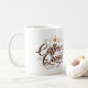 Caffeine Queen" is an elegant and sophisticated design featuring a flowing script font in deep espresso, crowned with a delicate gold icon above the text. The design is adorned with subtle swirls and steam-like curls in warm mocha and cream tones, creating a sense of graceful movement. Set against a soft blush pink gradient that transitions to light beige, this design exudes a feminine and polished aesthetic. It’s the perfect choice for the modern, empowered woman who enjoys her coffee with a touch of luxury and style.