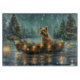 Set sail into the magic of the holiday season with this beautifully detailed illustration, showcasing a proud dog sitting in a festively decorated boat, gliding across a serene Christmas lake. The twinkling lights from nearby pine trees reflect off the water, casting a warm, festive glow that enhances the cosy ambiance. Ornaments dangle from the boat's sides, while glowing lanterns light the way, creating a scene that captures the true essence of Christmas warmth and joy. This nostalgic artwork brings a touch of holiday magic to any space, perfect for those who cherish the spirit of the season.