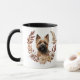 A pretty autumn wreath in tones of cinnamon brown, tan, and cream surround the watercolor image of an adorable Cairn Terrier Dog. The image is printed twice on the mug, with your custom text between them.