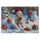 A spirited Cairn Terrier runs joyfully through the snowy winter scene, wearing a festive red Christmas hat. This lively design highlights the breed’s scruffy coat, adventurous personality, and playful charm while capturing the warmth and magic of the holiday season. A delightful winter moment full of festive cheer.