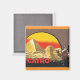 Vintage artwork featuring pyramids, sphinx, man riding a camel, a vivid sunset and "Cairo". Colours are bright golden yellow, orange red, sandy beige and rich brown
