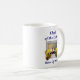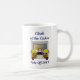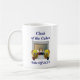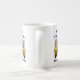 The whimsical graphic illustration decorating this coffee mug features a pair of cartoon cake characters wearing chequered oven mitts facing off with wooden spoons in front of a stainless steel oven door with a cake baking inside. Easily customised for your kitchen contest or competition.