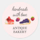 Cute cake shop sticker featuring illustration of cheesecake, tart, and fruits. The text says "handmade with love."