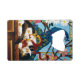 Calico cat playing with a red Chinese dragon in front of a peacock stained glass window.