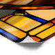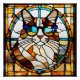 A calico cat wearing sunglasses is portrayed in stained glass.