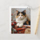 Postcard art featuring a painting of beautiful calico cat in a winter scene surrounded by red berries, pine sprigs and cosy fabrics.